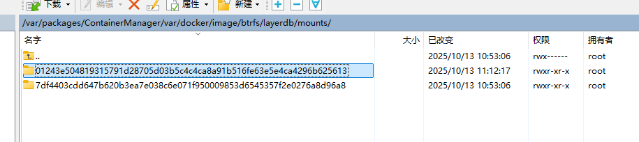 在目录 /var/packages/ContainerManager/var/docker/image/btrfs/layerdb/mounts 中找到此ID为名的目录
