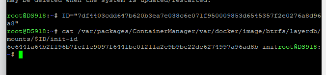 ID="7df4403cdd647b620b3ea7e038c6e071f950009853d6545357f2e0276a8d96a8" cat /var/packages/ContainerManager/var/docker/image/btrfs/layerdb/mounts/$ID/init-id