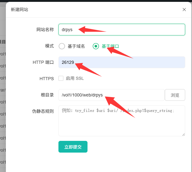 设置网站名称,端口,网站目录,提交